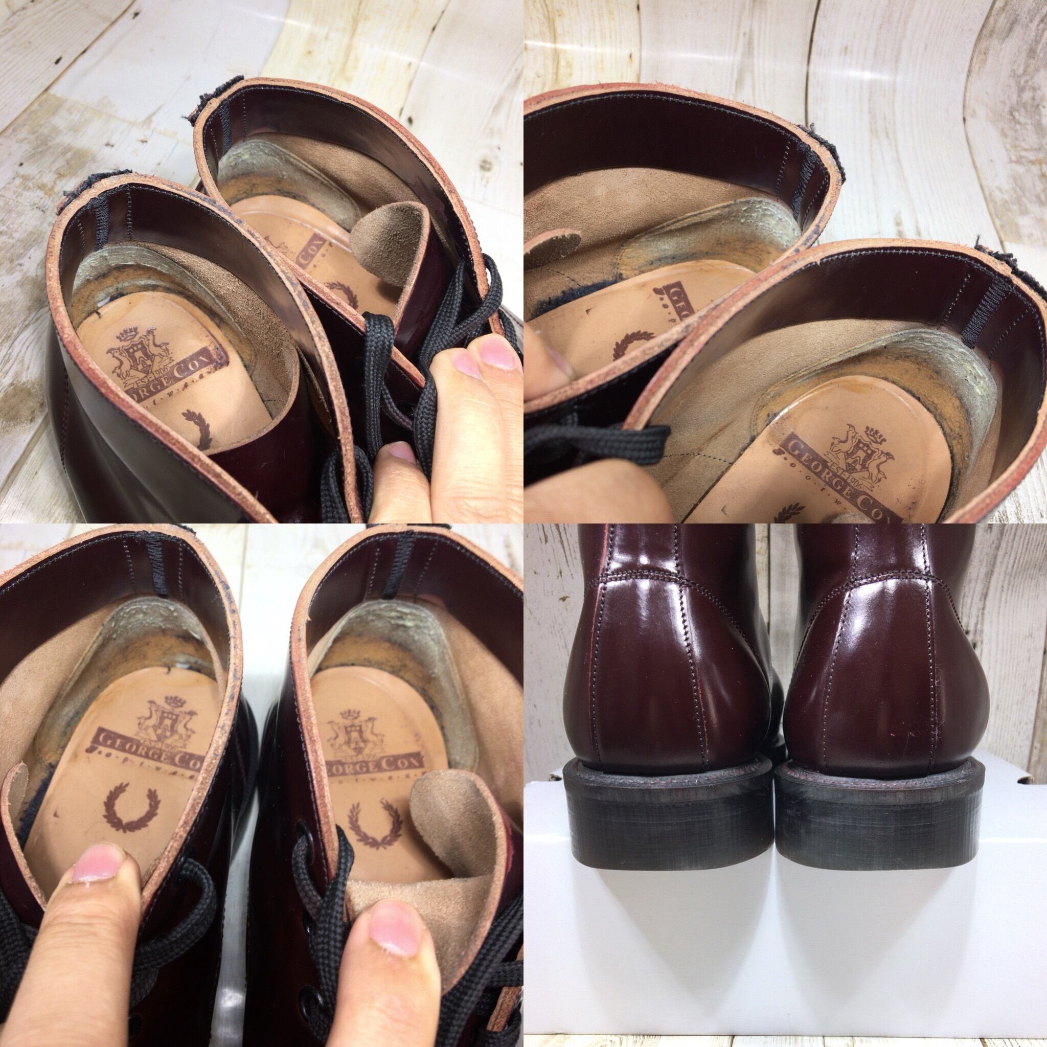 イギリスの名門 GEORGE COX ジョージコックス の ブーツ になります。両足共、かかとベロが切れています。使用感ありますがソール減りも少なくまだまだ活躍できます!